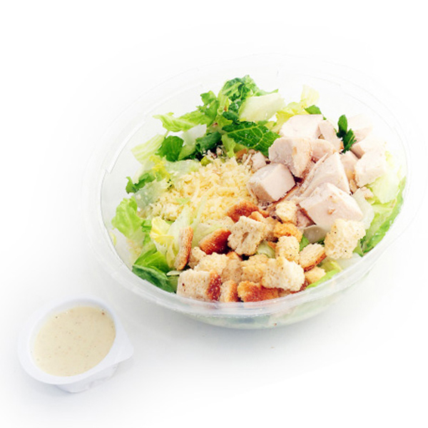 Pollo grillado, Queso parmesano en hebras, Croutones y Salsa Caesar.